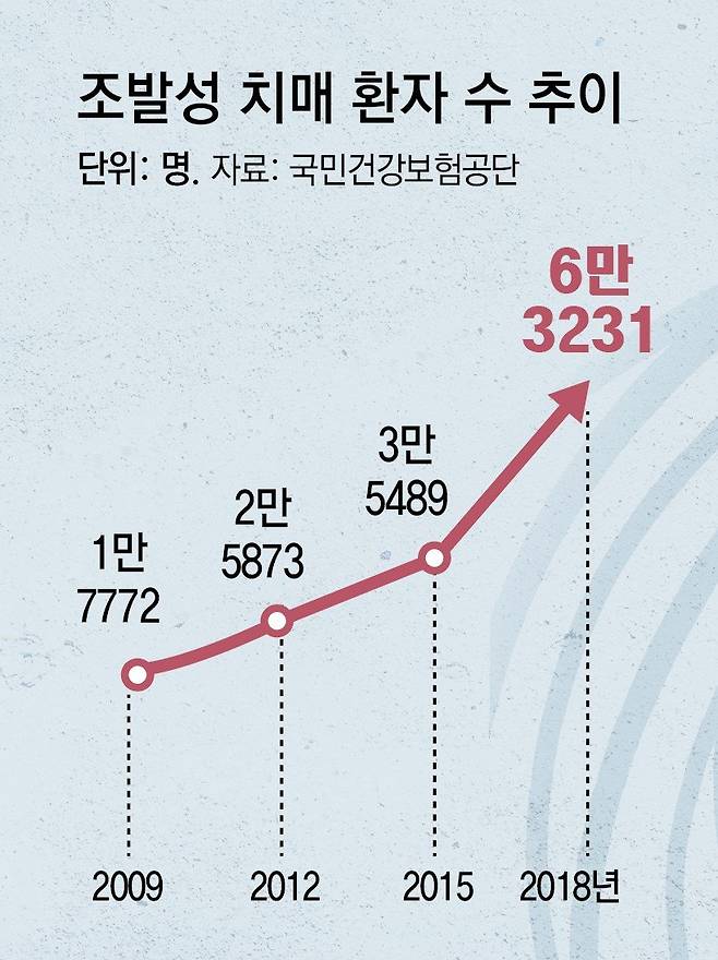 65세 미만에서 발병하는 치매를 ‘조발성 치매’라고 한다. 국내 조발성 치매 환자는 전체 치매 환자의 약 8% 수준이다. 국민건강보험공단에 따르면 국내 조발성 치매 환자는 2018년 6만3231명으로 2009년(1만7772명) 대비 3.6배로 급증했다. 의료계에서는 40, 50대 중장년층도 치매를 조기에 진단하고 예방하는 노력이 필요하다고 강조한다.