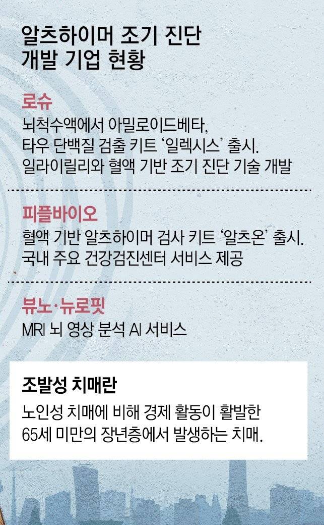 로슈는 이런 단점을 보완하기 위해 또 다른 글로벌 제약사 일라이릴리와 함께 혈액 기반의 알츠하이머 진단 기술을 개발 중이다. 국내에서는 피플바이오가 혈액 기반 알츠하이머 검사 제품인 ‘알츠온’을 개발해 현재 KMI 한국의학연구소, 하나로의료재단 등 국내 대형 건강검진센터들에 서비스를 제공 중이다.