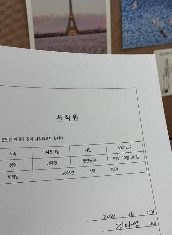 더불어 김다영은 SBS에 제출한 사직서도 공개했다. 퇴직일은 2025년 4월 28일로, 퇴사와 동시에 배성재와의 '럽스타그램'을 시작한 셈이다.