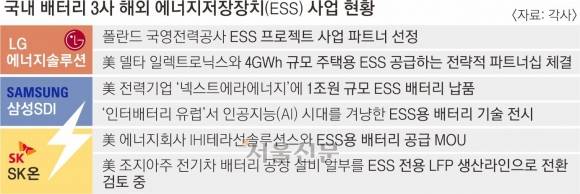 삼성SDI는 미국 최대 전력기업 ‘넥스트에라 에너지’에 약 1조원 규모의 ESS용 삼원계(NCA) 배터리를 납품하고 있다. LG에너지솔루션은 미국 델타 일렉트로닉스와 4GWh 규모의 주택용 ESS를 공급하는 전략적 파트너십을 체결했다. 폴란드 국영전력공사 ESS 프로젝트의 사업 파트너로 선정되기도 했다.