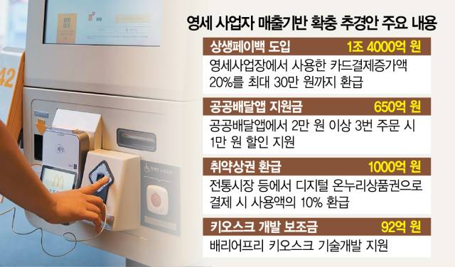 이날 국회 예산결산특별위원회가 심사에 돌입한 추경안에 따르면 정부는 ‘영세 사업자 매출기반 확충’ 명목으로 △상생페이백 도입 1조 4000억 원 △공공배달앱 지원금 650억 원 △취약상권 환급 1000억 원 △배리어프리 키오스크 기술개발 지원 92억 원 등 총 약 1조 6000억 원을 편성했다.