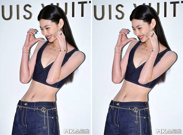 이날 행사에서 정호연은 데님 크롭 브라탑과 체인 벨트 디테일의 팬츠를 매치해 군살 하나 없는 날씬한 몸매를 자랑했습니다.