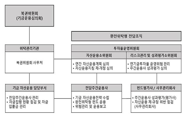 연기금투자풀은 기금 여유자금을 통합 운용해 규모의 경제 효과를 내고 있다. 수탁규모는 2002년 1조9000억원에서 지난해 말 62조1000억원으로 늘어난 상황이다. 투자풀위원회가 선정한 주간운용사가 자산을 관리하며, 운용사는 통합펀드내에 하위펀드를 자산으로 편입하는 재간접투자(fund of funds) 방식을 활용한다.