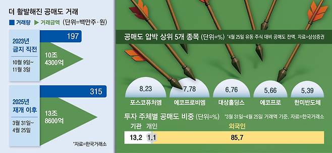 외국인투자자가 한 달 동안 약 12조원을 매매한 가운데 공매도 거래량은 2023년 금지 조치 직전보다 60% 늘었다. 글로벌 증시 변동성 확대 국면에서 국내 공매도 거래도 덩달아 증가했다는 설명이다.