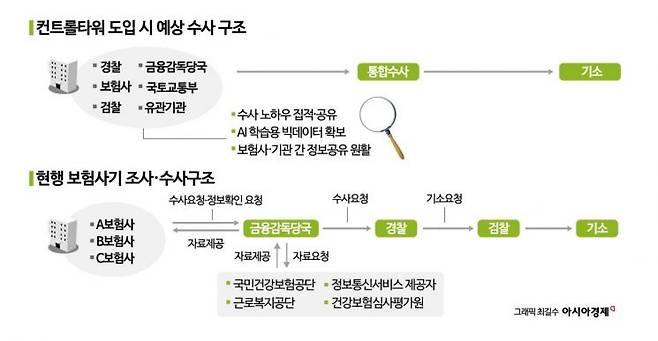 현재 금감원·경찰청·건보공단·보험사 등은 수사협의회를 열거나 업무협약(MOU)을 맺는 형태로 보험사기 방지를 위한 공조를 이어가고 있다. 하지만 이런 형태로는 실질적 성과를 내기 어려운 게 현실이다. 김태훈 금감원 보험사기대응단 실장은 "조직적 보험사기에 대해 처벌까지 이어지려면 경찰과 검찰 등 수사기관까지 넘어가야 종결되는 측면이 있다"면서 "정부 차원의 컨트롤타워를 신설하면 이 과정에서 더 시너지가 날 것"이라고 전했다.