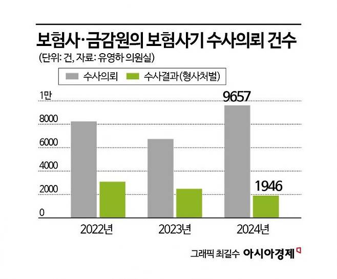 어렵게 확보한 자료를 근거로 보험사기임을 확신해 수사를 요청해도 결과를 듣기까지는 또 수년이 걸린다. 아시아경제가 유영하 국민의힘 의원실로부터 단독 입수한 자료에 따르면 보험사와 금융감독원이 보험사기를 수사의뢰한 건수는 2022년 8245건 2023년 6789건 2024년 9657건으로 올해 1만건을 돌파할 전망이다. 반면 의뢰한 수사가 형사처벌(징역·벌금 등) 등 최종 결론난 건수는 2022년 3097건, 2023년 2520건, 2024년 1946건으로 갈수록 감소하고 있다. 연도별 수사의뢰 대비 결론비중은 2022년 38%, 2023년 37%, 2024년 20%로 갈수록 줄고 있다. 지난해 기준 보험사기 의심으로 수사의뢰를 요청해도 5건 중 4건은 결과를 확인할 수 없었던 셈이다.