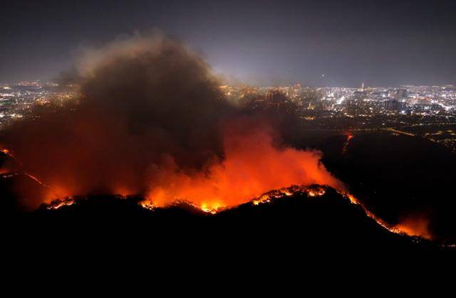 28일 대구 북구 노곡동 함지산에서 발생한 산불이 초속 11m의 강한 바람을 타고 민가 방향으로 번지고 있다. 산불 확산으로 북구 조야동과 노곡동 일대 주민 2,000명 이상이 인근 초등학교로 긴급 대피했다. 소방당국은 국가소방동원령을, 산림당국은 산불 대응 3단계를 발령하며 진화에 나섰다. 대구=뉴시스