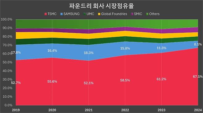 | ▲ 2019년 이재용 삼성전자 회장의 '비전 2030' 발표 후 파운드리 시장점유율, 반토막이 났습니다. (데이터 출처 : 트랜드포스) |