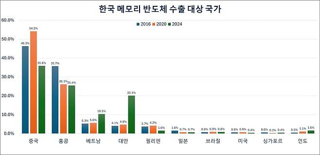 | ▲ 한국 메모리 반도체의 최대 수요처는 중국이었는데, 윤석열 정부 출범 이후 그 비중이 크게 줄었습니다. 그 자리를 중국 회사들이 차지하고 있습니다. 미국으로의 직접적인 메모리 반도체 수출은 1% 미만입니다. (데이터 출처 : 무역협회) |