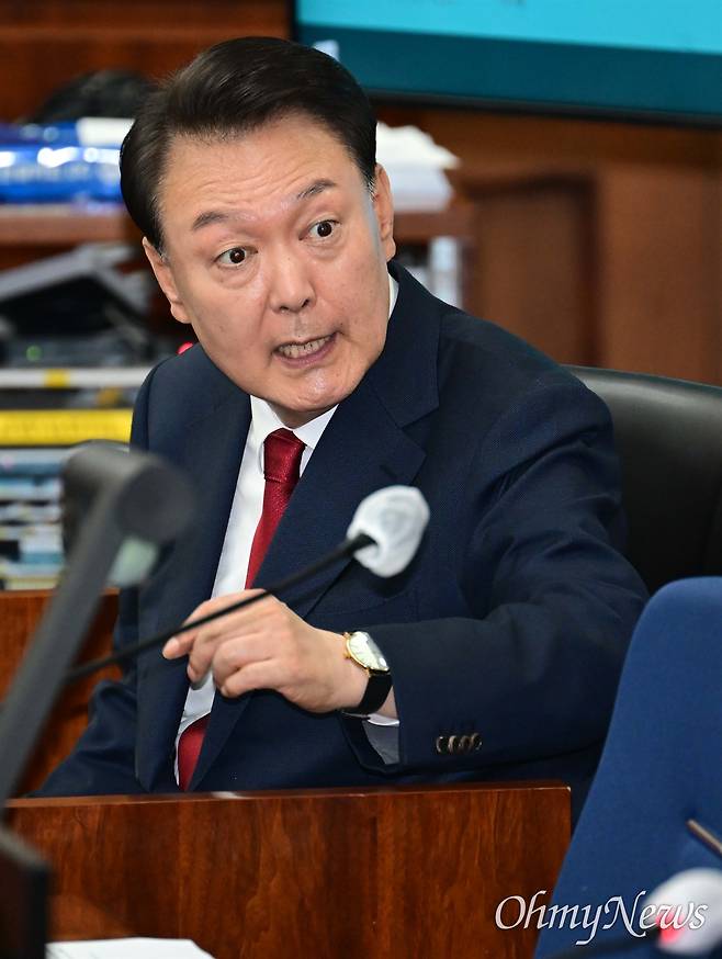 윤씨는 지난 21일 서울중앙지방법원 형사합의25부(재판장 지귀연 부장판사) 심리로 열린 2차 공판에서 또 다시 발언권을 얻었다. 그는 "세세한 말씀은 드리지 않겠다"면서도 6분간 장황하게 말을 쏟아냈다. 그는 "이 내란 사건이라고 하는 것이 대통령의 헌법상 권한인, 대통령만이 쓸 수 있는 권한인 계엄 선포와 관련해서 '계엄이 내란'이라는 구조를 갖고 이뤄진 것이기 때문에 원래 담고 있는 헌법적 쟁점이 상당히 많다. 통상 있는, 통상 형사법정에서 다뤄지는 사건이 아니기 때문에"라고 했다.