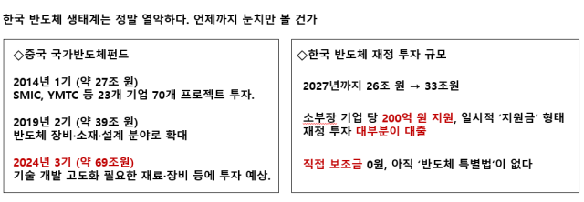 지금 그나마 정부가 ‘영끌’해서 지원하기로 한 금액은 마치 코로나 펜데믹 때 시민들에게 나눠줬던 지원금처럼 임시적인 투자 보조금 성격이 강합니다. 중국처럼 기업들의 지갑에 팍팍 현금을 꽂아주는 직접보조금이 있으려면 ‘반도체특별법’이 제정돼야 하는데, 이건 언제쯤에나 통과가 될지 오리무중입니다.