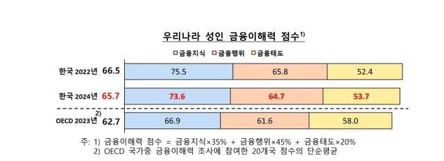 한국은행과 금융감독원이 29일 발표한 ’2024 전국민 금융이해력 조사’에 따르면 지난해 우리나라 성인의 금융이해력 점수는 65.7점로 집계됐다. 2022년(66.5점)에 비해 소폭 하락했으나, OECD 평균(2023년 기준, 62.7점)보다는 높다.