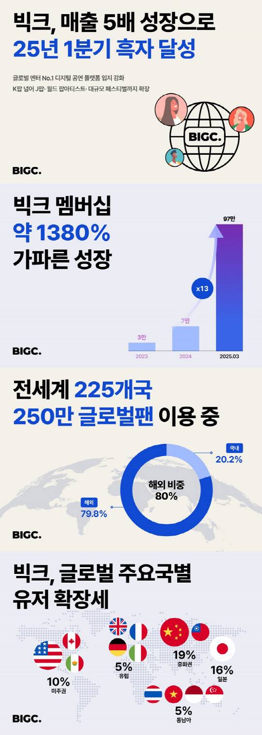 글로벌 공연, 엔터 시장을 타깃한 엔터테크 스타트업 빅크(BIGC.)가 2025년 1분기 기준으로 분기 흑자를 달성하며 가파른 성장세를 입증했다. 지난해 동기간 대비 매출은 약 5배, 유저 수는 13배 증가, 특히 2024년 부터 2025년 1분기까지 5분기 연속 분기별 성장율이 평균 60%에 달한 것으로 집계되며, 엔터테인먼트 업계에서 보기 드문 속도의 확장세를 기록 중이다.