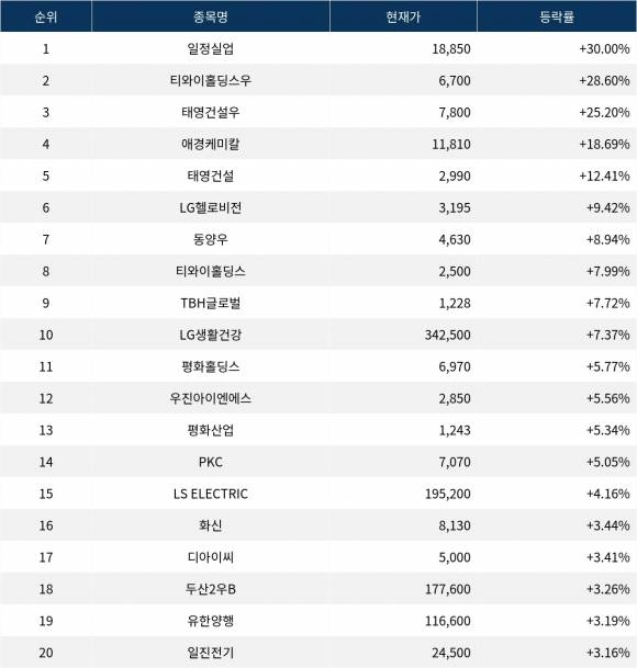 6위 LG헬로비전(037560)은 현재가 3,195원으로 9.42% 상승 중이다. 7위 동양우(001525)는 현재가 4,630원으로 8.94% 상승 중이다. 8위 티와이홀딩스(363280)는 현재가 2,500원으로 7.99% 상승 중이다. 9위 TBH글로벌(084870)은 현재가 1,228원으로 7.72% 상승 중이다. 10위 LG생활건강(051900)은 현재가 342,500원으로 7.37% 상승 중이다.