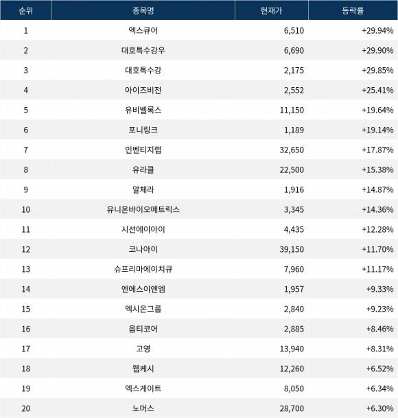 6위 포니링크(064800)는 현재가 1,189원으로 19.14% 상승 중이다. 7위 인벤티지랩(389470)은 현재가 32,650원으로 17.87% 상승 중이다. 8위 유라클(088340)은 현재가 22,500원으로 15.38% 상승 중이다. 9위 알체라(347860)는 현재가 1,916원으로 14.87% 상승 중이다. 10위 유니온바이오메트릭스(203450)는 현재가 3,345원으로 14.36% 상승 중이다.