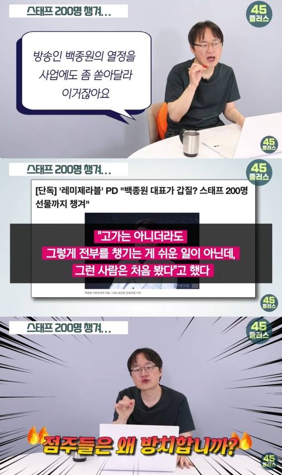 특히 '명절이나 프로그램 끝날 때마다 스태프들의 선물을 챙겼다'는 대목에서는 "분노를 참을 수 없다. 점주들은요? 저도 이런 사람 처음 봤다. 스태프들은 선물을 챙기면서 점주는 왜 방치하냐"고 분노했다.