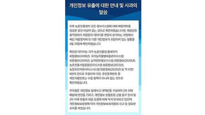 농촌진흥청은 유출 사고 이후 홈페이지에 해킹 사실을 밝히며 비밀번호 변경만 안내하다 농가 회원에게 직접적으로 해킹 사실을 전달한 것은 11일 이후인 21일에서야 문자로 송부한 것으로 드러났습니다.