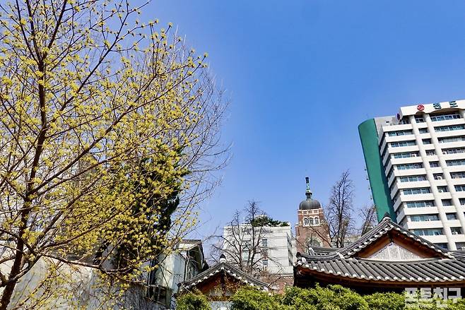 매화와 산수유, 목련 꽃이 멋진 색감 대비를 이룹니다.