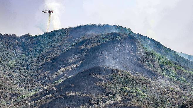 ▲ 대구 대형 산불 발생 이틀째인 29일 대구 북구 산불 현장의 산림이 잿더미가 된 가운데 헬기가 물을 투하하고 있다.