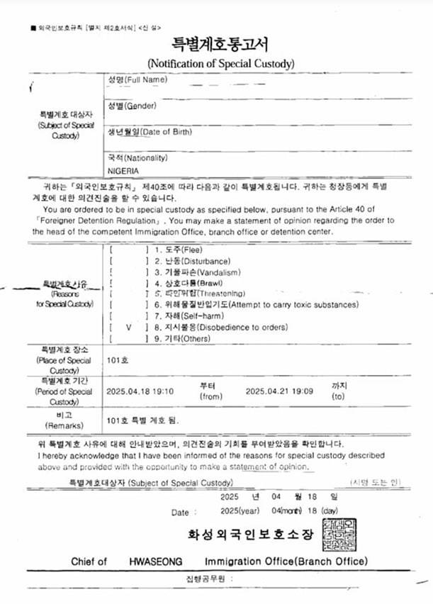 | ▲ V의 특별계호(=독방 구금)통고서 강제송환이 불발되자 화성외국인보호소로 돌아온 V는 사흘 간 독방에 구금되었다. 독방 구금(=특별계호) 사유는 ‘지시불응’이었다. |