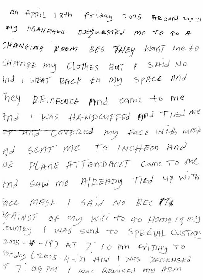 | ▲ 나이지리아 국적의 V가 보내온 자필편지 강제송환이 시도되었던 4월 18일의 이송과정과 그 이후 독방 구금에 대한 내용이 담겨있다 |