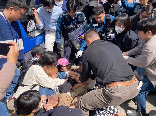 | ▲ 4월 23일 화성외국인보호소 정문 앞에서 경찰들이 시위대를 끌어내는 장면 두 명의 활동가가 현장에서 체포되어 수갑이 채워졌고, 이틀 만에 석방되었다. |