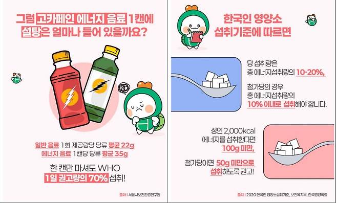 또 지난해 서울시보건환경연구원이 시중에 유통 중인 음료, 간식, 식사 대용 식품 91건을 조사한 결과 제로 음료를 제외한 음료류의 1회 제공량 당 당류 평균 함량은 22g으로 나타났다. 이는 세계보건기구(WHO) 1일 권고량(50g)의 44%에 해당하는 수준이다.