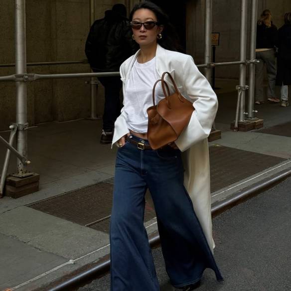 먼저 가장 쉬운 건 누구나 옷장에 하나쯤 있는 흰 티셔츠 와 청바지 일테죠. 캐롤라인 린은 그중에서도 드라마틱한 실루엣을 자랑하는 와이드 데님 진과 화이트 롱코트로 드레시함을 한 스푼 더했네요. 여기에 브라운 레더 백과 날렵한 슈즈로 도시적인 무드까지 가미했죠.
