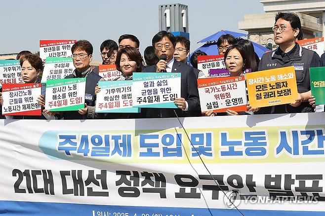 (서울=연합뉴스) 강민지 기자 = 이용우 국회 환경노동위원회 의원이 29일 서울 여의도 국회 앞에서 열린 '주4일제 도입 및 노동시간 단축 요구안 발표 기자회견'에서 발언하고 있다. 2025.4.29
