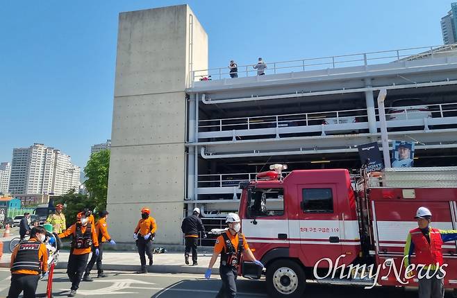 야구장인 창원NC파크 마산구장 주차장에서 추락사고가 발생했다.