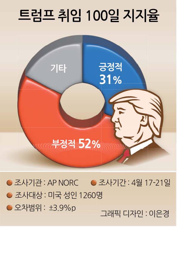 트럼프 대통령의 취임 100일차 지지율은 역대 최저치를 기록했다. AP통신과 시카고대 여론조사센터(NORC)의 공공정책연구센터가 함께 진행해 26일(현지시간) 발표한 설문조사 결과에 따르면, 미국인 10명 중 4명은 트럼프 대통령의 두 번째 임기 첫 100일을 “끔찍했다”고 답했다. 전체 부정평가 비중은 52%로 긍정평가 비중(31%)에 비해 크게 높았다.