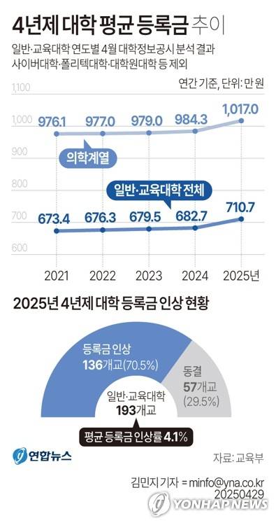 이에 따라 학생 1명이 연간 부담해야 하는 평균 등록금은 710만6천500원으로, 작년보다 27만7천원 상승했다.