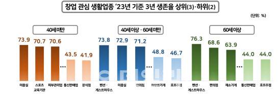 연령대별로 보면 40세 미만 사업자는 미용실(73.9%), 40세 이상 60세 미만 사업자는 펜션·게스트하우스(73.8%) 생존율이 높게 나타났다. 60세 이상 사업자도 펜션·게스트하우스(76.3%)가 가장 높았다. 40세 미만에서는 분식점(41.9%), 40세 이상 60세 미만과 60세 이상은 호프주점을 운영했을 때의 생존율이 가장 낮았다.