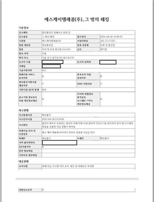 ▲ SK텔레콤의 해킹 사건 KISA 신고서