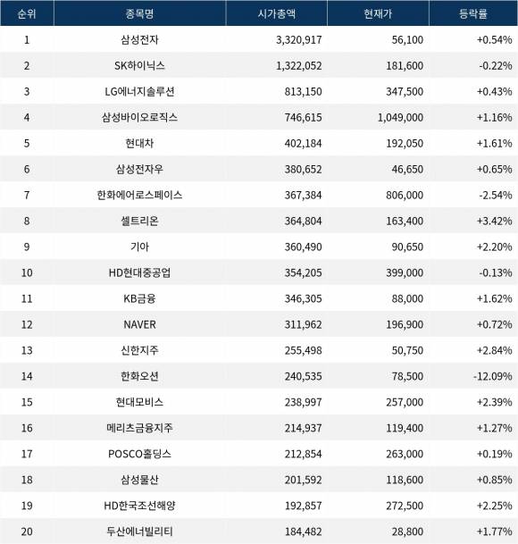삼성전자(005930) +0.54%, SK하이닉스(000660) -0.22%, 셀트리온(068270) +3.42% 등락
