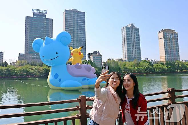 방문객이 석촌호수에 설치된 메타몽 리프라스 대형 벌룬 앞에서 사진을 찍고 있다. (롯데물산 제공. 재판매 및 DB 금지) 2025.4.29/뉴스1