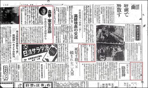 | ▲ 박정희 전 대통령 만주군 혈서 지원 사실을 보도한 <만주일보> 1939년 3월 31일자 신문. 붉은 색 선으로 표시된 부분이 해당 기사 부분이다. |
