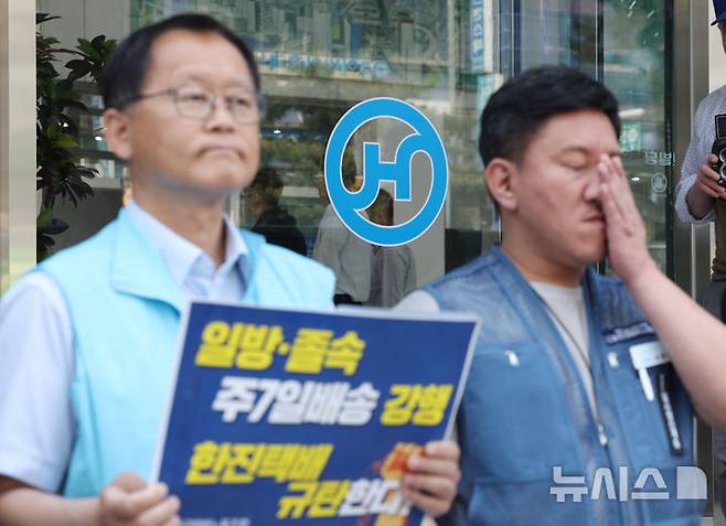 [서울=뉴시스] 김진아 기자 = 전국택배노동조합 관계자들이 29일 서울 중구 한진 본사 앞에서 한진의 택배노동자 기만, 택배현장 교란행위 중단 촉구 기자회견을 하고 있다. 2025.04.29. bluesoda@newsis.com
