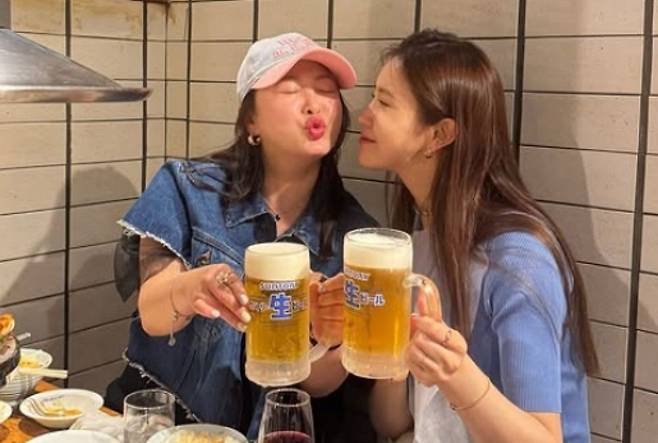 두 사람은 서로 밀착해 앉아 맥주잔을 들고 포즈를 취하는가 하면, 하늘색 계열의 상의를 맞춰 입은 트윈룩 복장으로 다정한 분위기를 드러내 시선을 모았다.