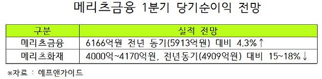 지난해 2년 연속 '2조 클럽'을 달성하며 역대 최대 실적을 기록했던 메리츠금융지주가 올 1분기에도 6000억원 넘는 당기순이익을 거둘 전망이다.