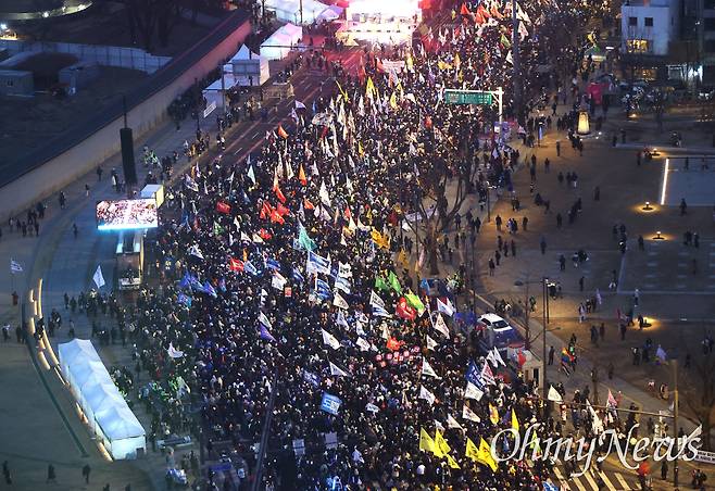 | ▲ ‘윤석열 즉각 퇴진! 사회대개혁! 11차 범시민대행진’이 지난 2월 15일 오후 서울 종로구 광화문앞에서 윤석열퇴진비상행동 주최로 열렸다. 깃발, 응원봉을 든 시민, 노동자들이 행진을 시작하고 있다. |