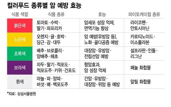 미국국립암연구소는 암을 예방하려면 하루에 5가지 색깔의 과일과 채소 등 다양한 식품을 섭취하라고 권장한다. 이는 붉은색, 노란색, 초록색, 보라색, 흰색 등이 포함된 채소·과일 등을 가리키며, '컬러푸드'라고 지칭한다. 컬러푸드엔 암을 예방하는 '파이토케미컬'이란 물질이 있다. 파이토케미컬은 종류가 여럿인데, 식품의 색깔별로 들어있는 종류가 다르고 효과도 다르다.