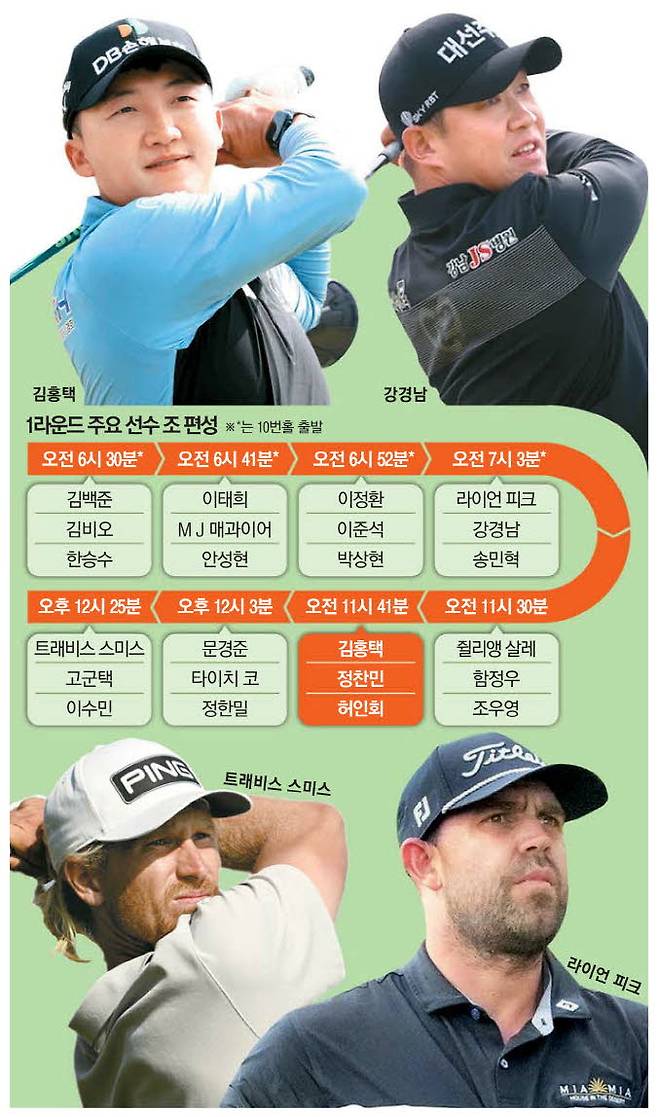 이어 2019년과 2020년 2연패를 달성했던 이태희가 국가대표 안성현, M J 매과이어(미국)와 오전 6시 41분에 티오프를 한다. 2016년과 2018년 대회를 우승했던 박상현은 이정환, 이준석(호주)과 오전 6시 52분에 시작한다. 2017년 대회 우승자 이상희는 지난 27일 끝난 우리금융 챔피언십에서 우승한 캐나다 동포 이태훈, 남아프리카공화국 강자 이언 스나이먼과 오전 7시 14분에 10번홀에서 첫 티샷을 날린다.