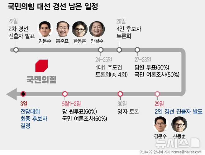 [서울=뉴시스] 국민의힘 제21대 대통령 선거 후보자 선출을 위한 최종 경선에 김문수 후보와 한동훈 후보가 29일 진출했다. 최종 후보 1인 선출을 위한 전당대회는 오는 5월3일 오후 2시 경기 고양시 일산 킨텍스에서 열린다. (그래픽=안지혜 기자)