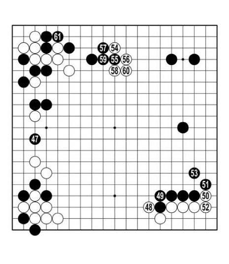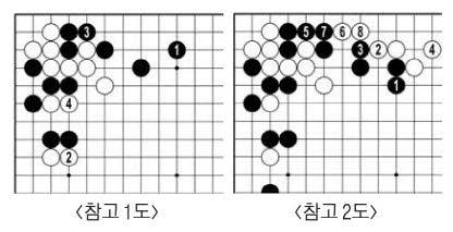 왼쪽에 둔 흑47은 지금 꼭 두어야 할 정도로 큰 곳인가. 다르게 먼저 48에 뻗는 수도 좋아 보인다. 또는 <참고 1도> 흑1에 벌리면 3으로 살리는 수가 생긴다. 좋은 걸 다 가질 수 없으니 백2와 4를 맞은 흑돌이 충격을 받는다. 백54로 다가가자 흑57로 물러났다. <참고 2도>라면 백 모양이 알차다.