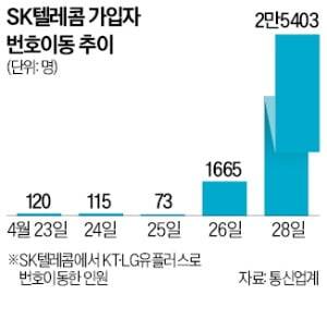 통신업계에 따르면 지난 28일 하루에만 SK텔레콤에서 3만4132명이 빠져나갔다. 흥미로운 점은 같은 날 8729명이 SK텔레콤으로 갈아탔다는 것이다. SK텔레콤 가입 조건으로 스마트폰을 30만~70만원가량 저렴하게 구매할 수 있도록 우회 보조금을 지원하는 것 아니냐는 지적이 나오는 이유다.