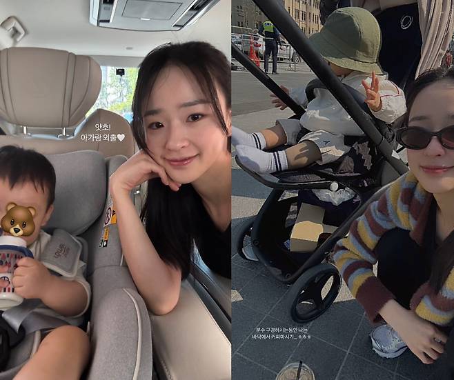 29일 손연재는 개인 채널에 "얏호! 아가랑 외출♥"이라는 문구와 함께 여러 장의 사진과 영상으로 일상을 공유했다. 사진 속 손연재는 카시트에 앉은 아들 옆에서 손으로 턱을 괸 채 밝게 미소 짓고 있다.