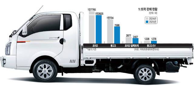 29일 카이즈유데이터연구소에 따르면 올해 1분기 현대자동차 포터2 판매량은 1만5032대(전기차 포함)로 전년 동기(2만642대) 대비 27.2% 줄었다. 기아 봉고3는 같은 기간 8864대 판매돼 1년 전(1만1932대)보다 25.7% 감소했다. 완성차업계 관계자는 “현대차 울산공장은 대부분 라인이 특근을 하는데 포터 생산 라인만 특근 계획이 단 하루도 없다. 재고가 쌓여있어서 계약하면 즉시 출고가 가능한 상태”라고 말했다.