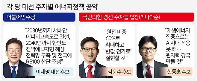 [단독] 글로벌 RE100 압박… 이재명 “서해 재생에너지도로” 김문수·한동훈 “원전 확대” [대선 이슈 톺아보기]