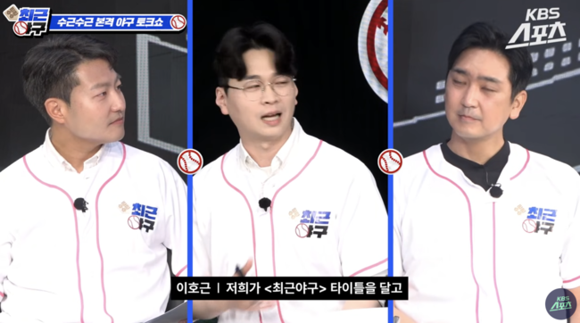 영상에서 MC 이호근 캐스터는 “제목이 생겼다. 이거 누가 만들었냐”라며 프로그램 타이틀인 ‘수근수근 최근야구’를 자랑스러워했다. 이는 심수창의 ‘수’와 이호근의 ‘근’을 더해 만든 이름이라고. 이에 심수창은 의미심장한 미소를 지었다.